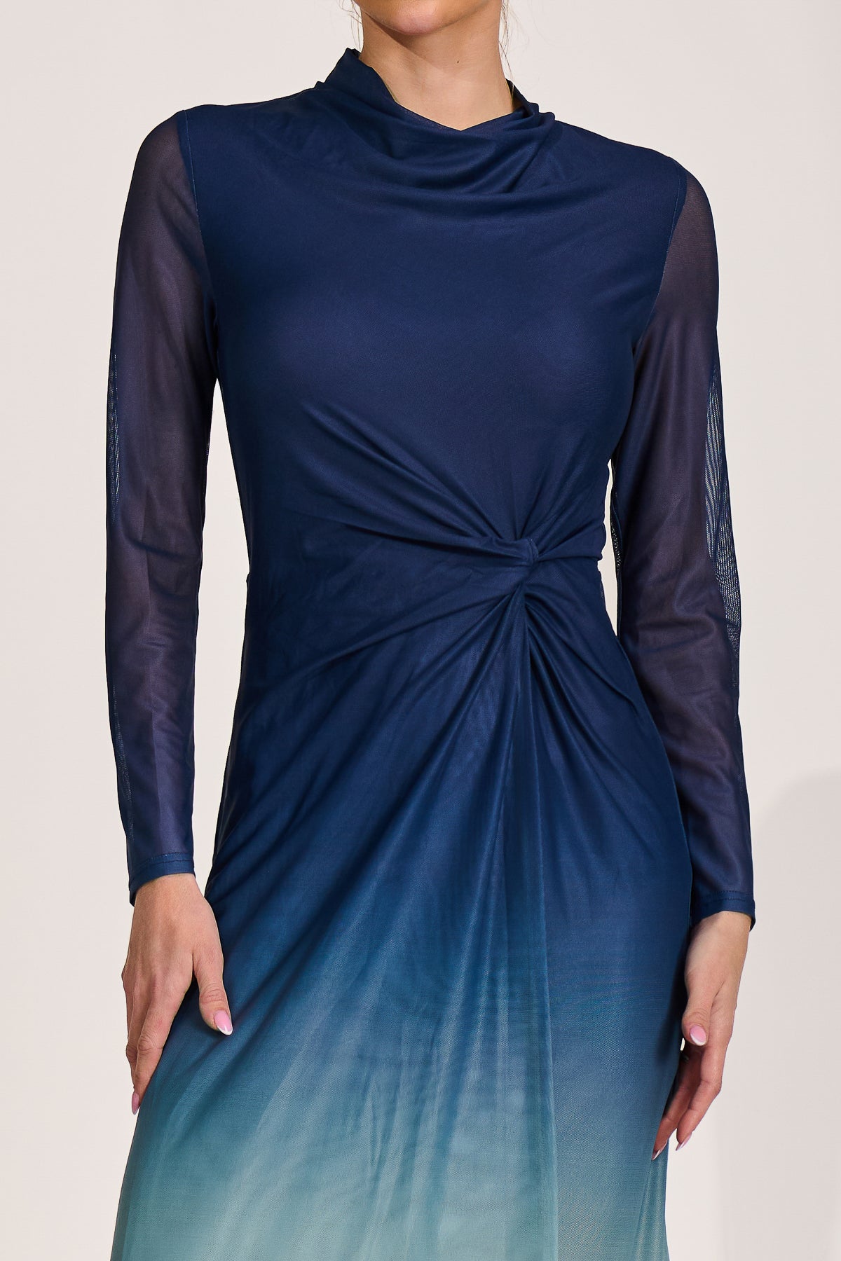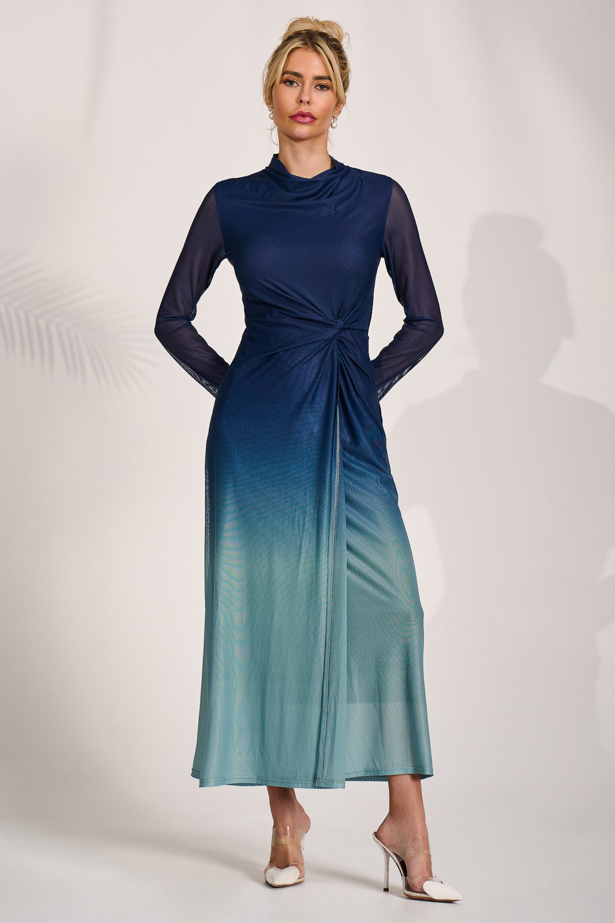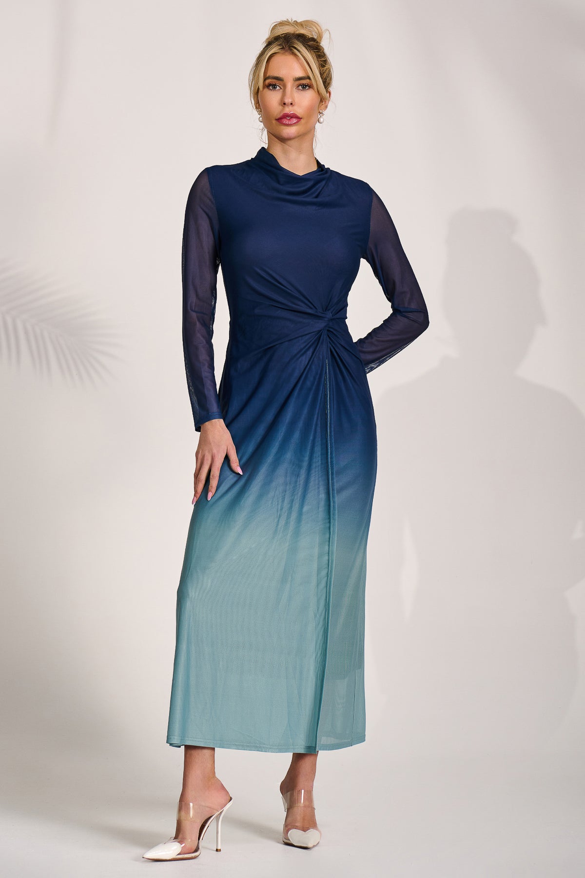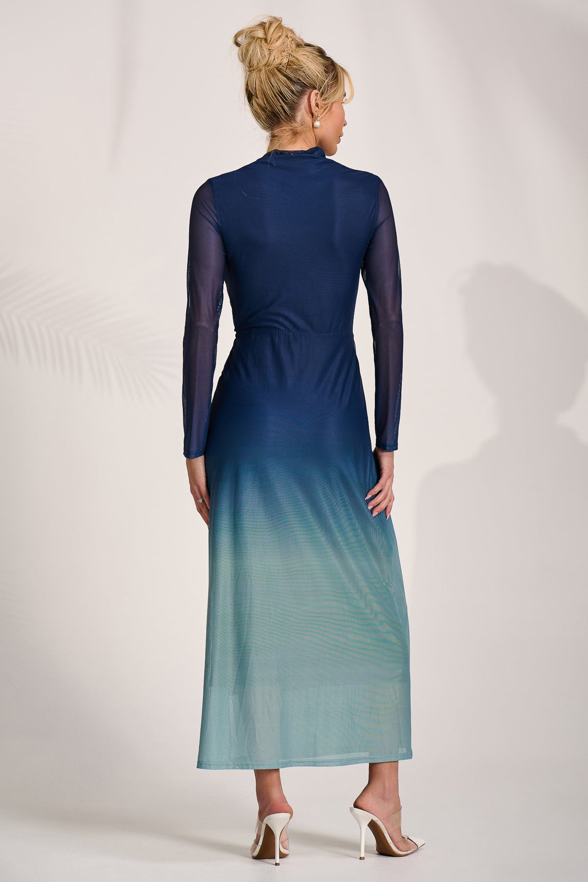 Petite Long Sleeve Mesh Maxi Dress by Jolie Moi features a high neckline, knot detail at the waist with a wrap-style front, long sheer sleeves, and is fully lined for comfort. Model’s height – 170cm, and wears size 8.