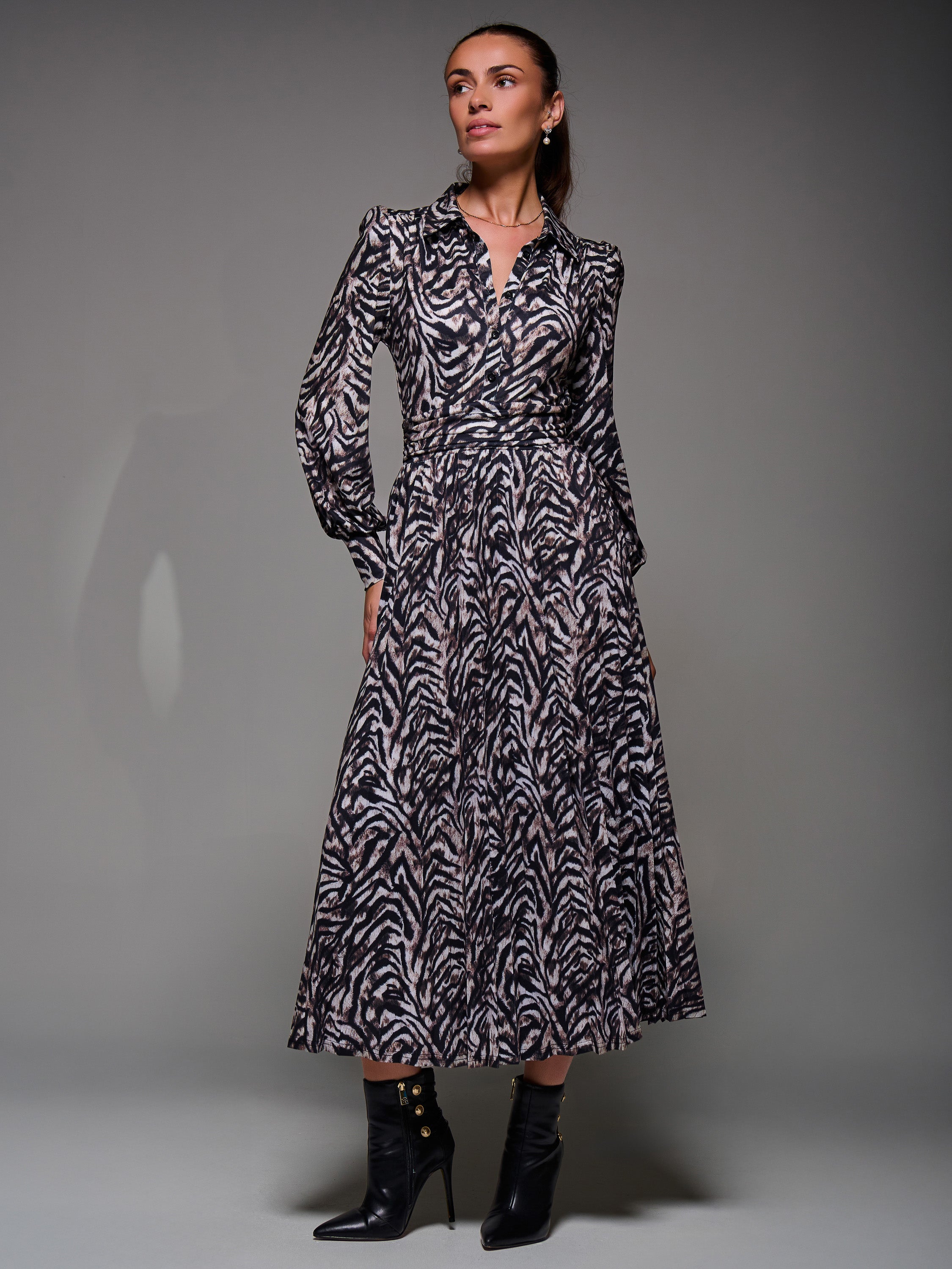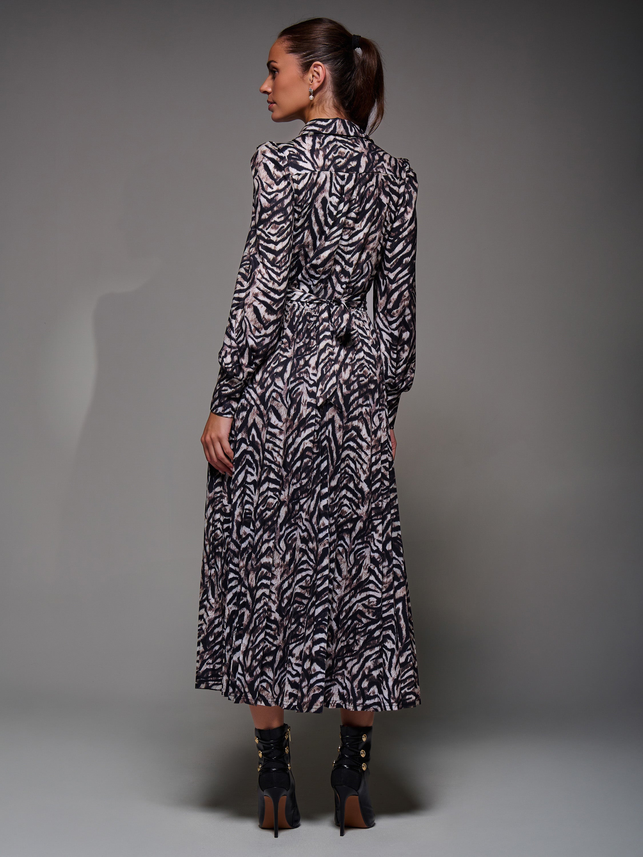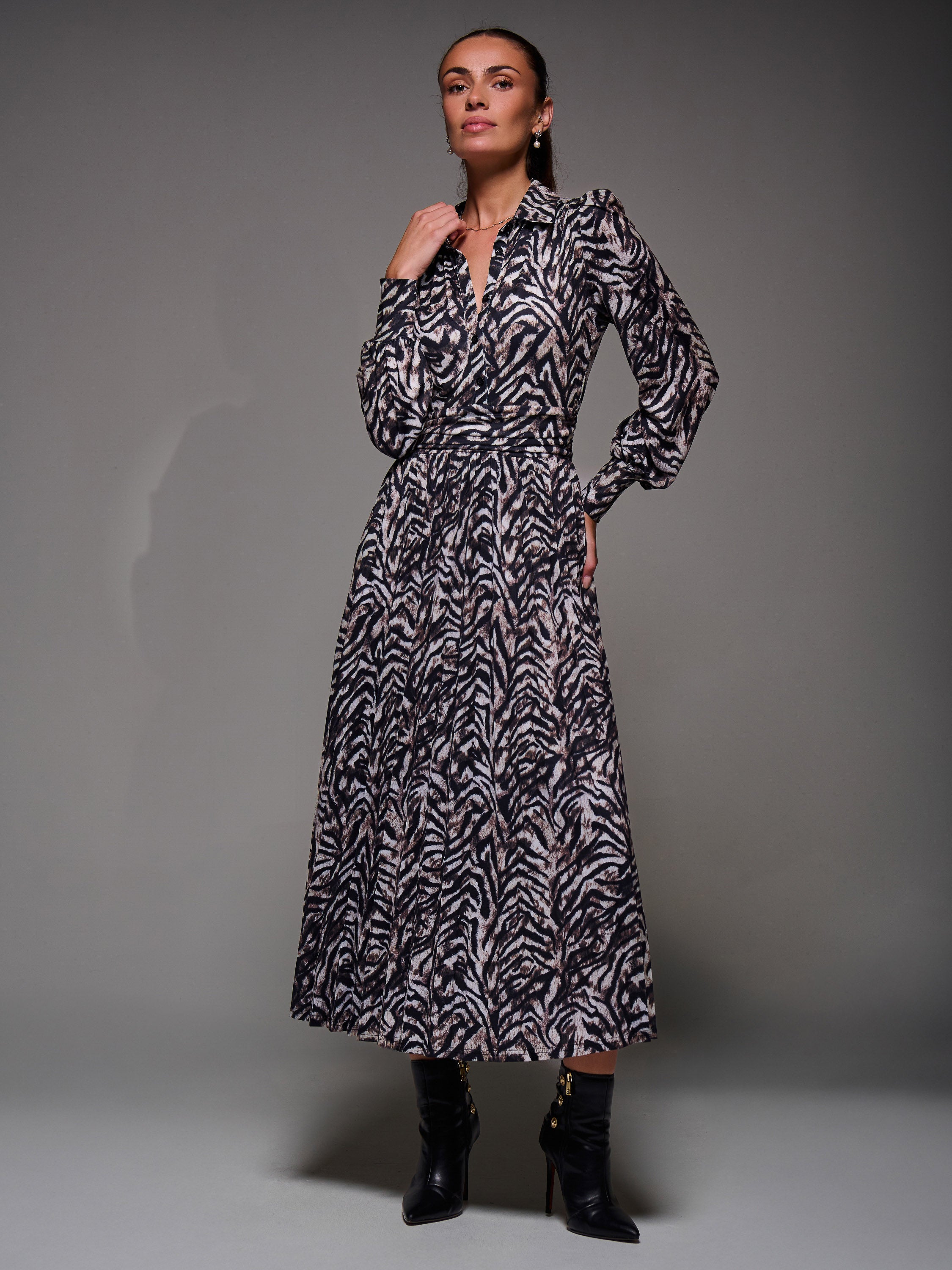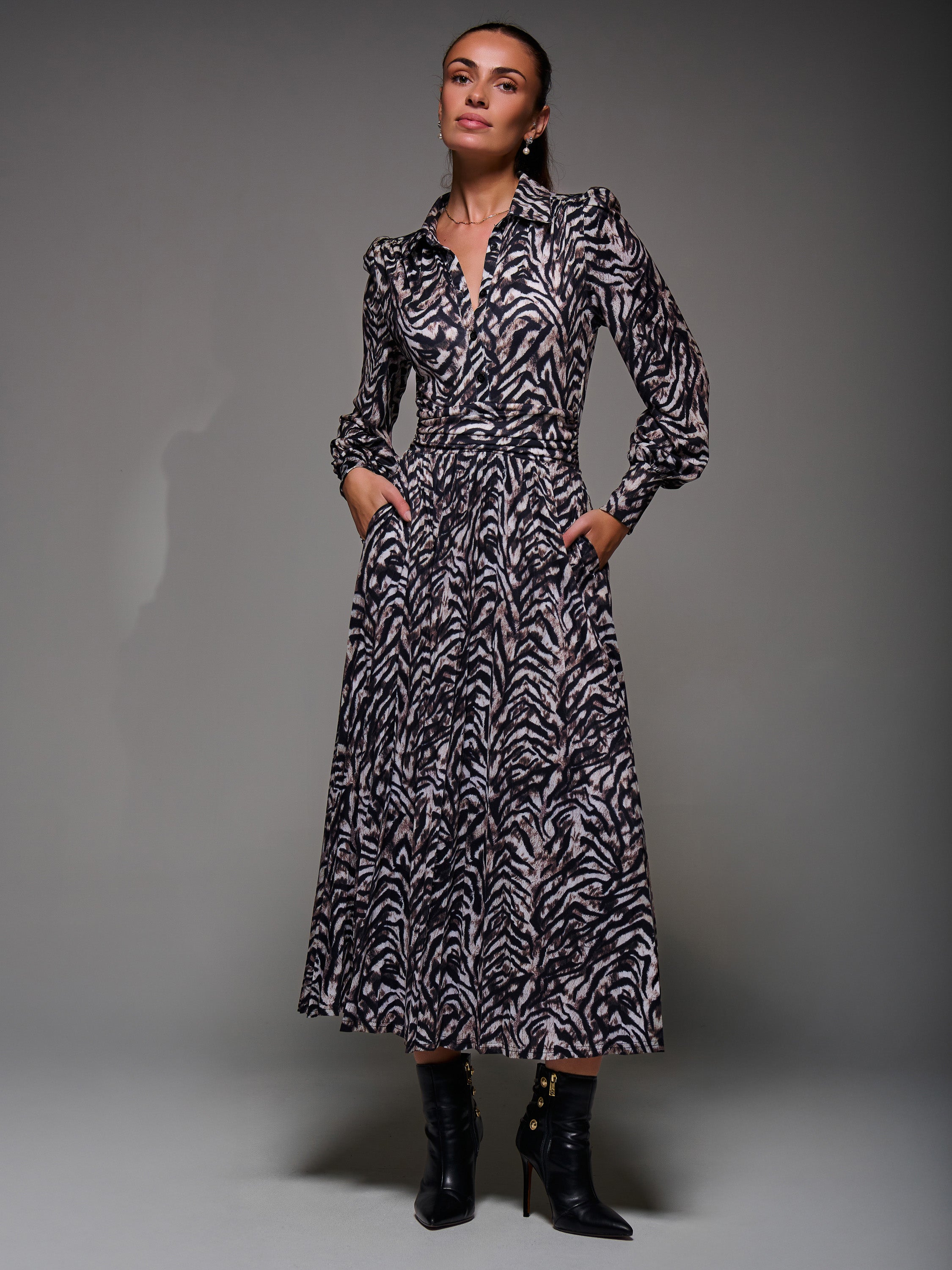The Long Sleeve Pleated Jersey Maxi Dress by Jolie Moi. Made from soft jersey fabric, this maxi-length dress features a button-up shirt design with a structured collar neckline. It has cuffed long sleeves and a flowing pleated skirt for graceful movement. Fully lined, the dress also includes a tie detail at the back to cinch the waist, along with two discreet side pockets for practicality.